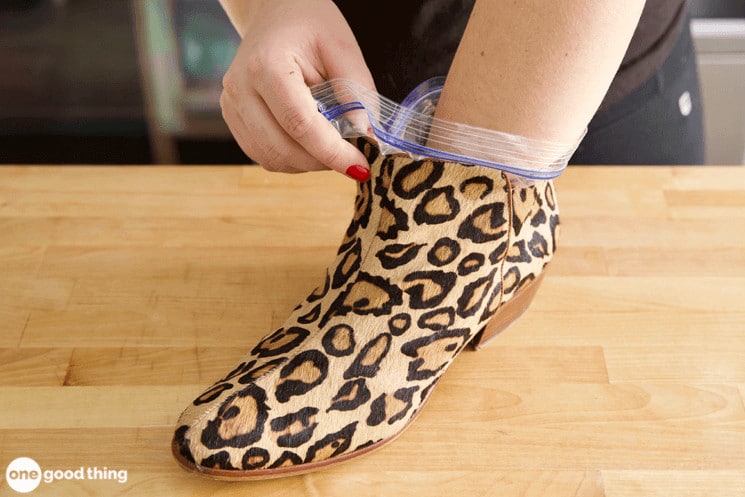 Commencez par glisser un sac à l’intérieur de l’autre, histoire d’éviter tout risque de fuite. Placez-les ensemble au fond de la chaussure, en veillant à bien épouser chaque recoin. Avec la main, appliquez une pression pour que le sac épouse la forme intérieure du soulier.