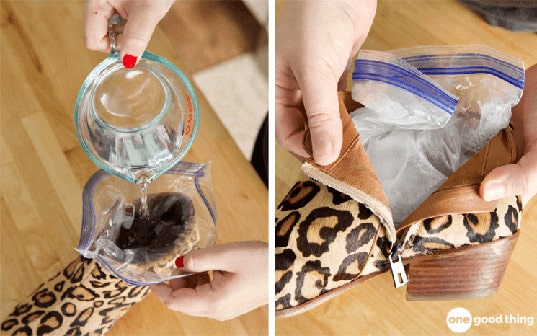 Placez la paire au congélateur et patientez jusqu’à ce que l’eau soit complètement gelée. En se transformant en glace, le volume de l’eau augmente, de près de 9%, et pousse doucement le cuir à s’élargir.